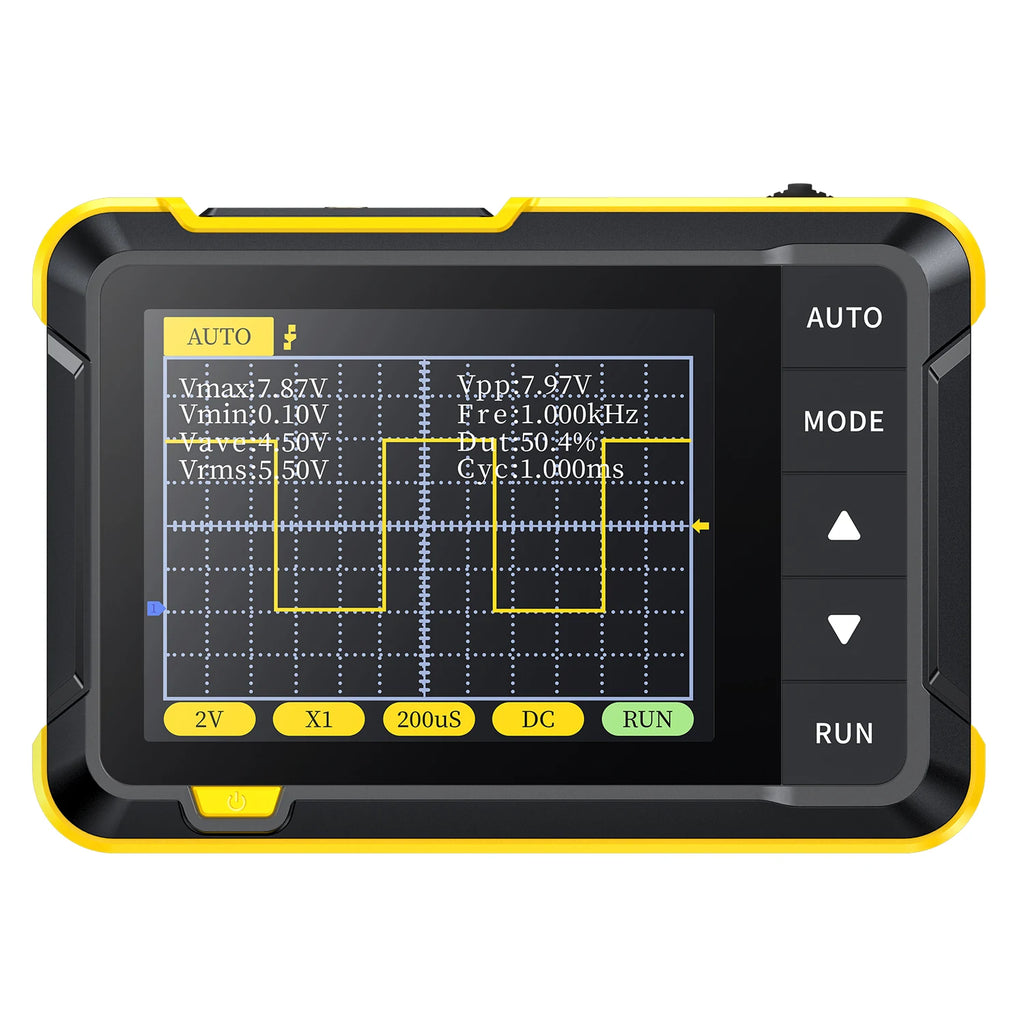 "DSO152" is a highly practical and cost-effective handheld oscilloscope launched by our company, which is aimed at the maintenance industry and the research education industry. The oscilloscope has a real-time sampling rate of 2.5MS/s, abandwidth of 200KHz, and complete trigger functions (single, normal, and automatic). It can be used freely for both periodic analog signals and non-periodic digital signals, and can measure voltages up to ±400V. Equipped with an efficient one-key AUTO, it can display the measured waveform without cumbersome adjustments. Equipped with a 2.8-inch 320*240 resolution high-definition LCD screen. Built-in 1000mAh high-quality lithium battery, can be used continuously for about 4 hours after fully charged.